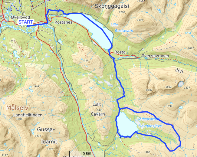 Starten går fra Råvatn skytebane. Krysser fylkesveien og kjører ned på Råvatnet. Kjører av vannet i øst-enden og kommer inn på kraftlinja etter ca 200 meter. Følger denne ca 5 km. OBS etter 2 km krysses veien til Dividalen. Fra Øvergård kjøres det på Tamokelva i 1,5 km før løypa svinger østover og klatrer opp 50 m til Stormyra og Sverresvolltjønna.